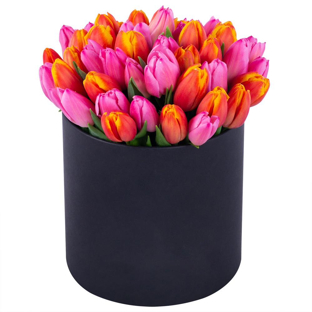 Букет микс из 51 тюльпана в черной шляпной коробке