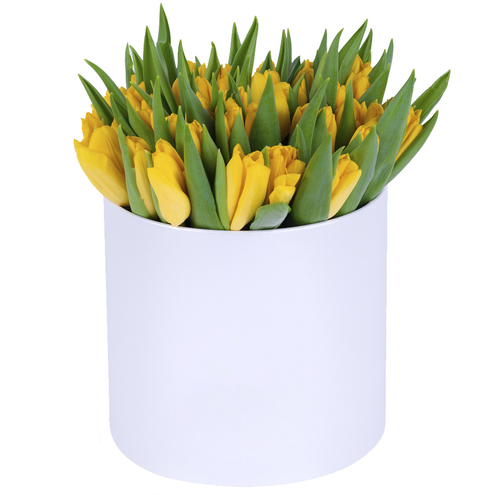 51 желтый тюльпан в белой шляпной коробке